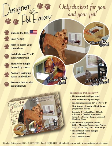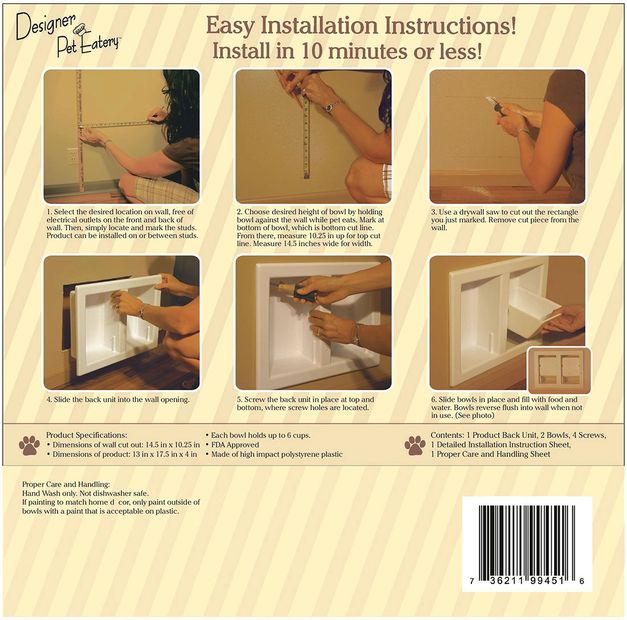 The Designer Pet Eateries is a pet eatery that is mounted within the wall and elevated to the height desired by the owner. Each elevated pet bowl is removable and can hold up to 6 cups and is made of high impact polystyrene plastic which is environmentally friendly and is FDA approved. Not dishwasher safe. It is the first dog food bowl or cat food bowl with a custom installed look that the homeowner can do themselves in less than 10 minutes in any 2 x 4 constructed wall. It comes in 6 designer colors or can be painted to match your room’s décor. Our designer pet eatery dog bowl measures 4.5 inches out from your finished wall..